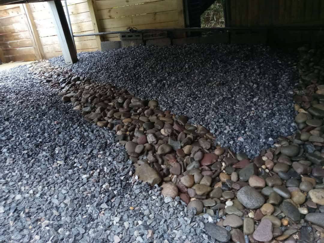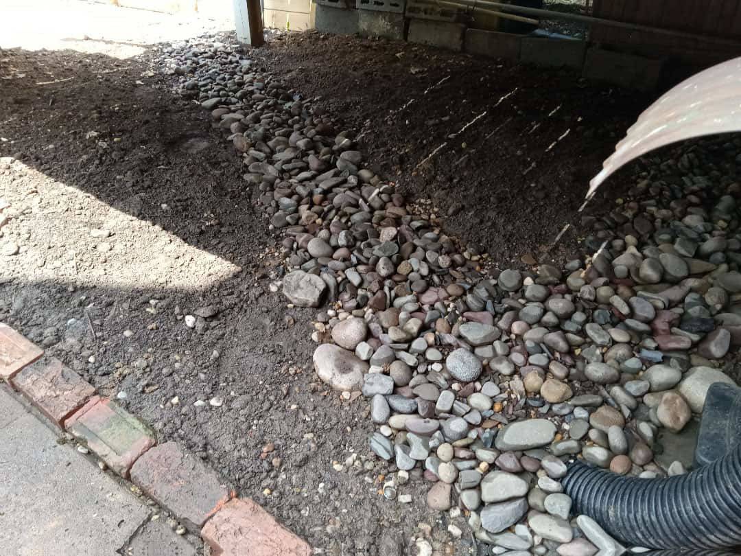 We graded this client's soil and created a beautiful and functional swale covered with river rock under her deck to resolve drainage issues.